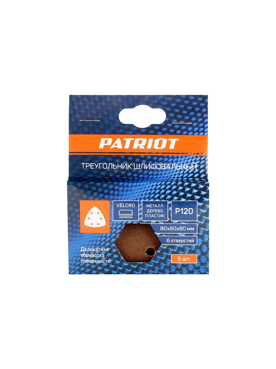 Купить Треугольник шлифовальный PATRIOT на липучке, 80х80х80мм, Р120, 6 отверстий, 5 шт в Брянске вы можете в сети магазинов "Современный ДОМ". Адреса магазинов
