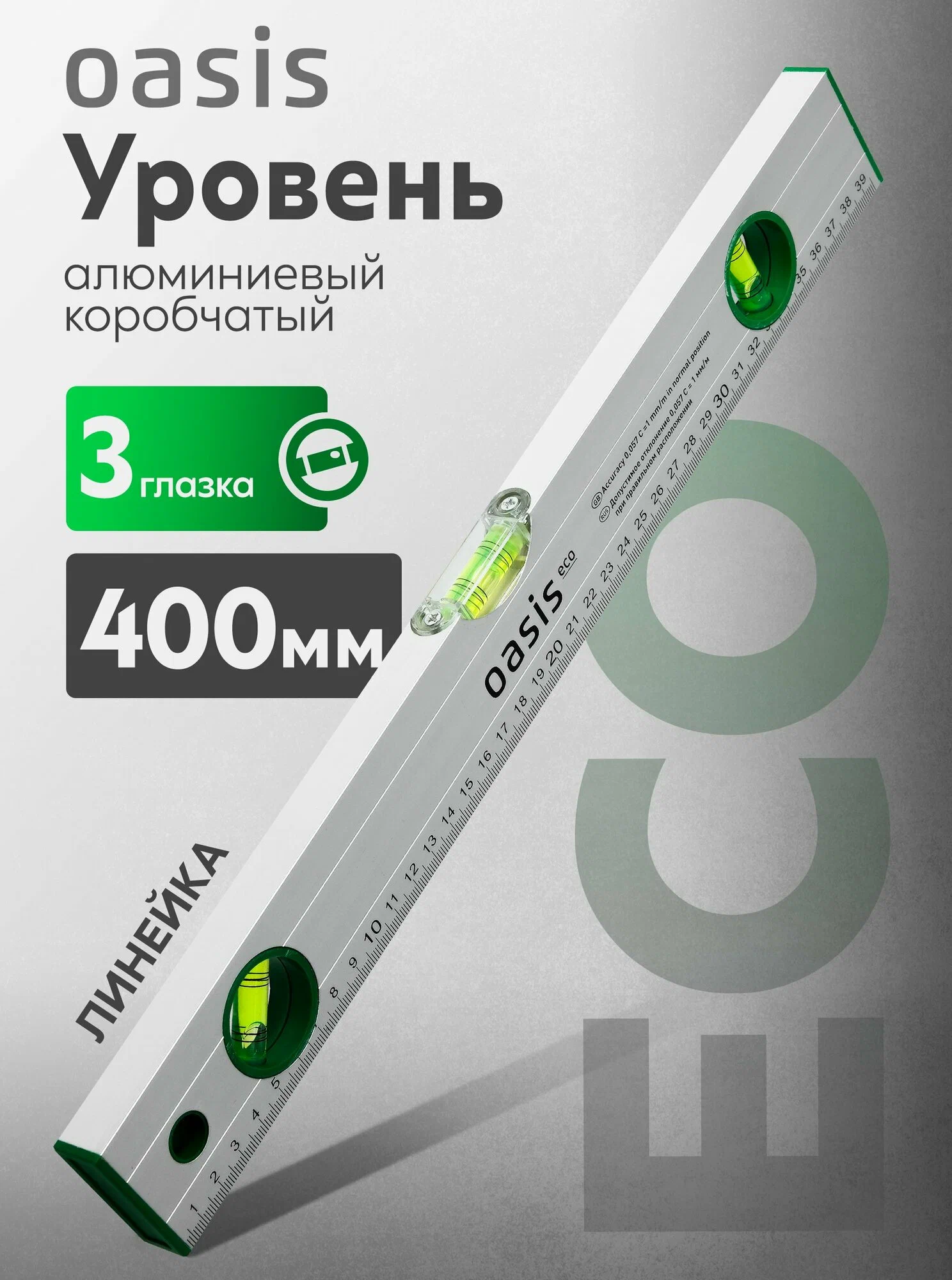Уровень алюминиевый Oasis Eco 400мм, коробчатый, 3 глазка, линейка